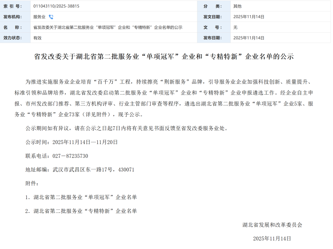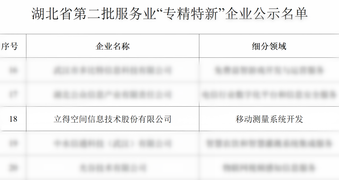 近日,湖北省发改委公示湖北省第二批服务业“专精特新”企业认定名单,立得空间信息技术股份有限公司成功入选。此次遴选表彰是我省推进实施服务业企业培育“百千万”工程,持续擦亮“荆新服务”品牌,引导服务业企业加强科技创新、质量提升、标准引领和品牌培养的重要举措。